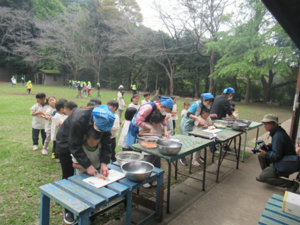 遊び着を着て、お手伝いのお母さま方が皮をむいてくれた野菜を包丁で切ります。