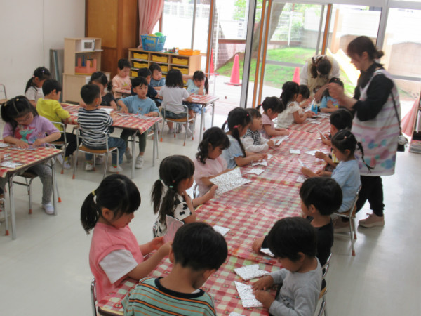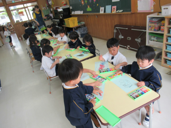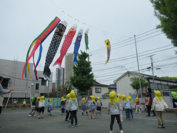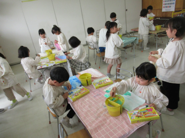 お天気の良い日は外遊びが気持ち良い4月。 お部屋では、製作も楽しんでいます。 年少組は初めてのクレヨンを使って、年中組は何やらゴシゴシ。 年長組は絵具を使って…こいのぼりを作りました。 年長組が作った大きなこいのぼりは園庭のこいのぼりと一緒に空を泳いでいます。