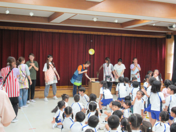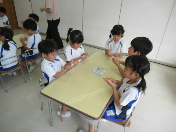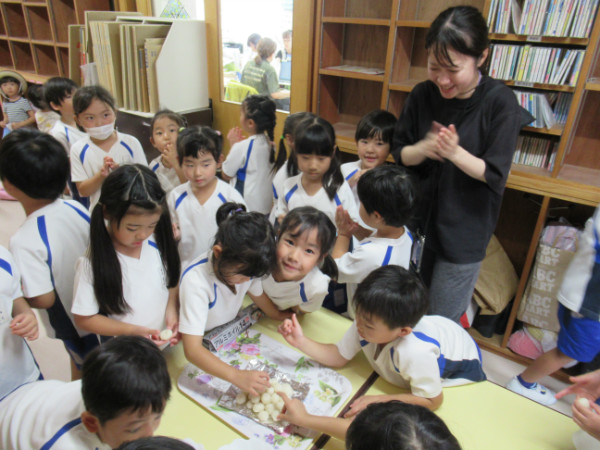 それじゃあ、みんなで作ろうと、年少・年中は紙粘土で、年長組は団子粉でおだんご作り。