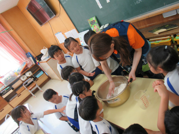 茹で上がって浮いてきたおだんごに大喜びの子どもたち。