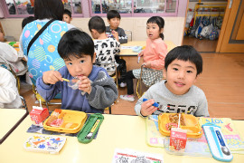 週5回給食を実施しています。2026年度(令和8年度)より1,2歳児小規模保育園内で自園調理した昼食を、第2幼稚園のお子さんも食べる予定です。