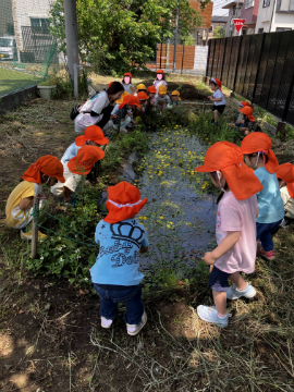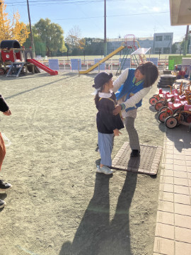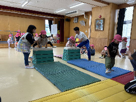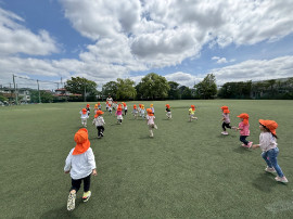 園庭では、固定遊具や、縄跳び、フラフープ、三輪車、スクーター、ボールなどで遊びます。 またグラウンドでは、鬼ごっこ、リレー、ドッジボールなど、広い場所で思う存分体を使って遊んでいます。