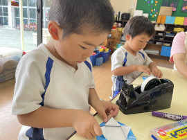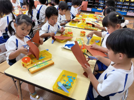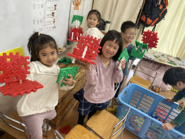 教室に入り、持ち物を片付け、手洗い、シール貼りなどをすませたら、思い思いに遊び始めます。
