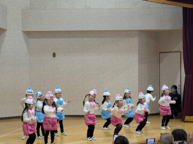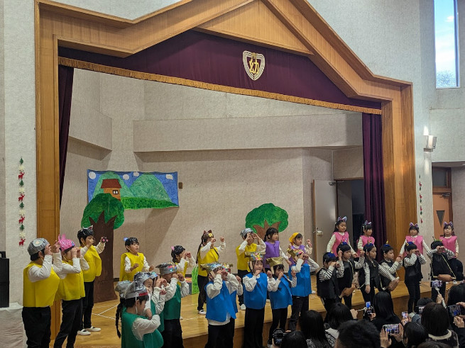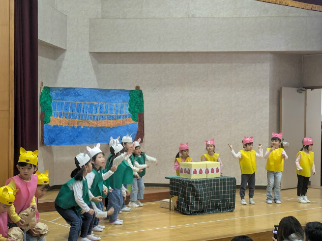 生活発表会 12月5日(金)今年度の生活発表会が行われました。年少組はうた、自分で選んだ遊戯を初めて保護者の前で披露しました。生き生きと物怖じしないで自分らしさを出していましたね。年中組はうたとオペレッタ、初めてセリフの入ったお話しに合わせて演技をしました。子どもたち同士歩調を合わせ劇を作り上げて居ましたね。うたもうまくなっています。年長組は劇のセリフや音楽、効果音、装飾、大道具、小道具もみんなでつくり、一体感のあるオリジナルな劇になりました。最後の合唱も聴かせるものでした。3年間の成長を感じる発表会でしたね。