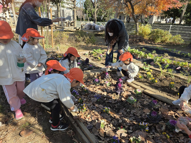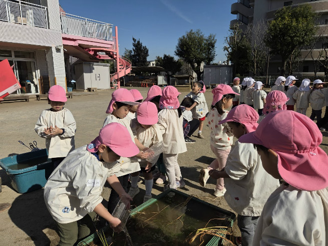 12月8日(月)年中組2クラスを対象に自然体験ワークショップを園庭で行いました。テーマは「ビオトープ池をかいぼりしよう・ちょうちょの花壇の冬支度」ということで前半、後半で行いました。ビオトープ池はまず、網で池の中の土と水をすくい、ケースに入れ生き物調査をしました。メダカやイトトンボやシオカラトンボののヤゴ、ユスリカ、モノアラガイなどが見つかりました。メダカもトロ舟2つで全体で30匹は生存していました。その後のかいぼりで水を抜き、土を整え(高低をつくり)、水を入れました。マツモの水草を新たに入れて、最後に生き物(メダカ、ヤゴ)を入れました。ちょうちょの花壇はまず、植物の観察(五感を使い、手触り、臭いを体験)、冬を越せるように花の周りに落ち葉を敷き詰めました。他学年は熱心に生き物観察を行いました。